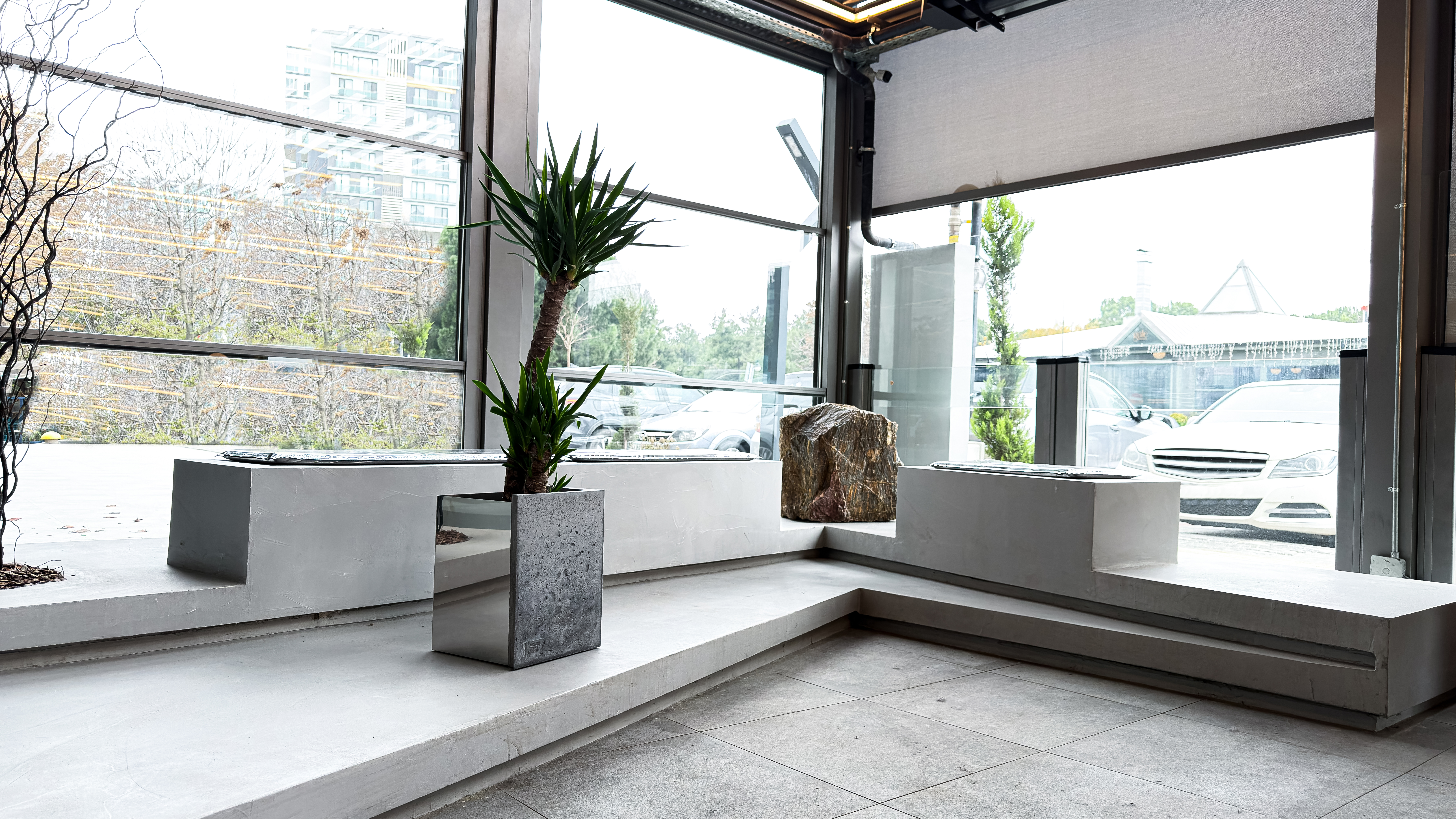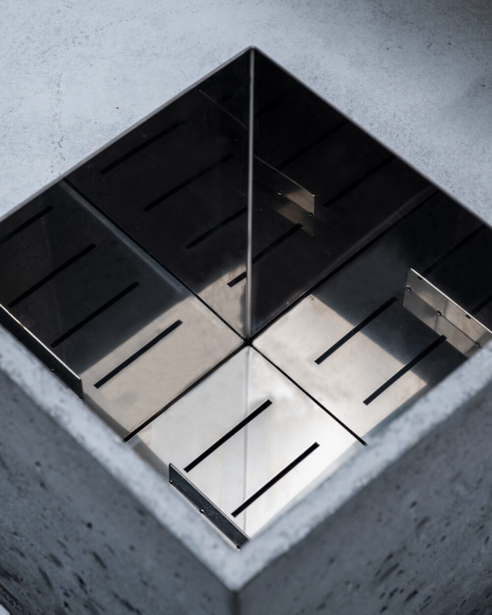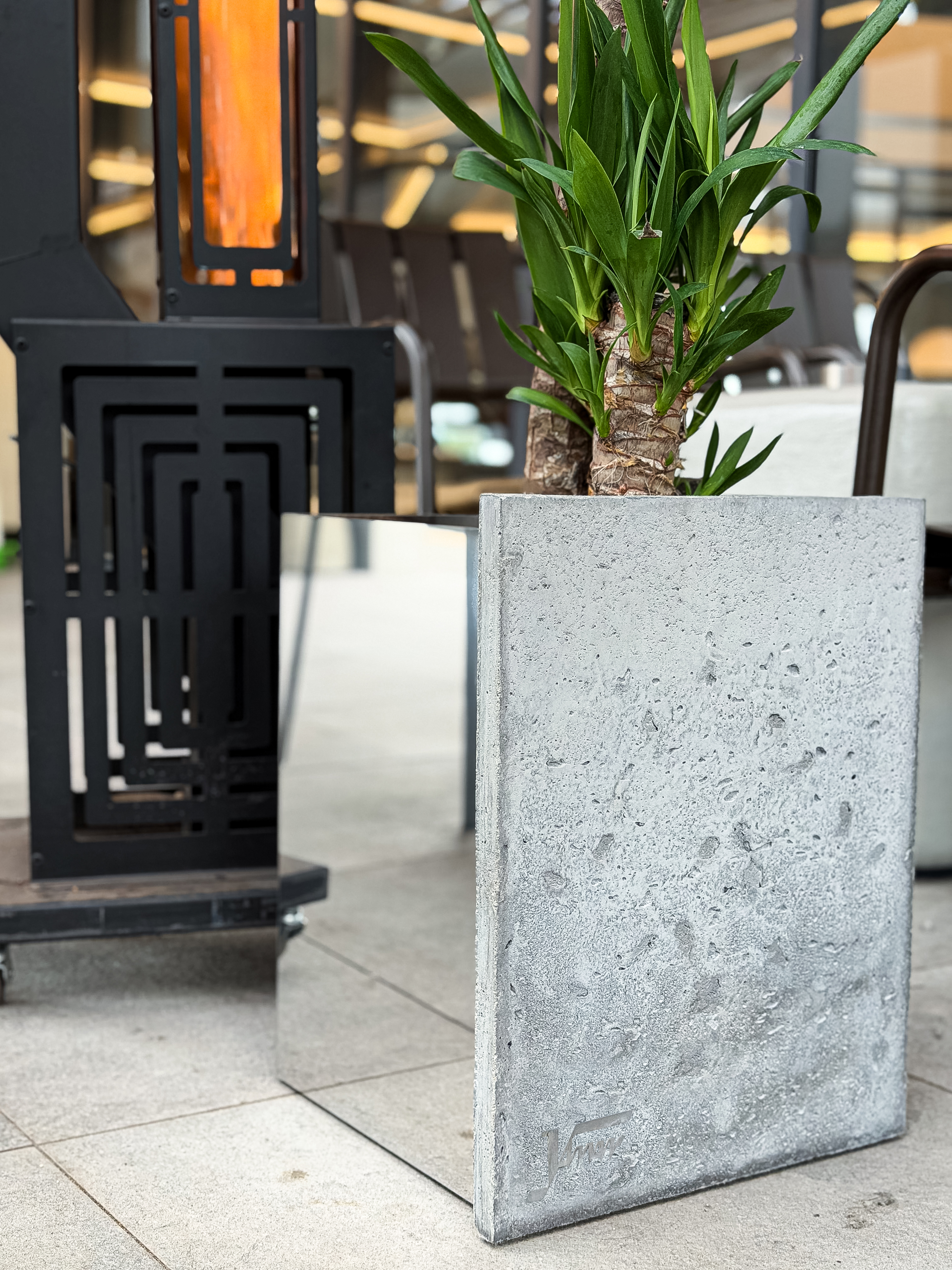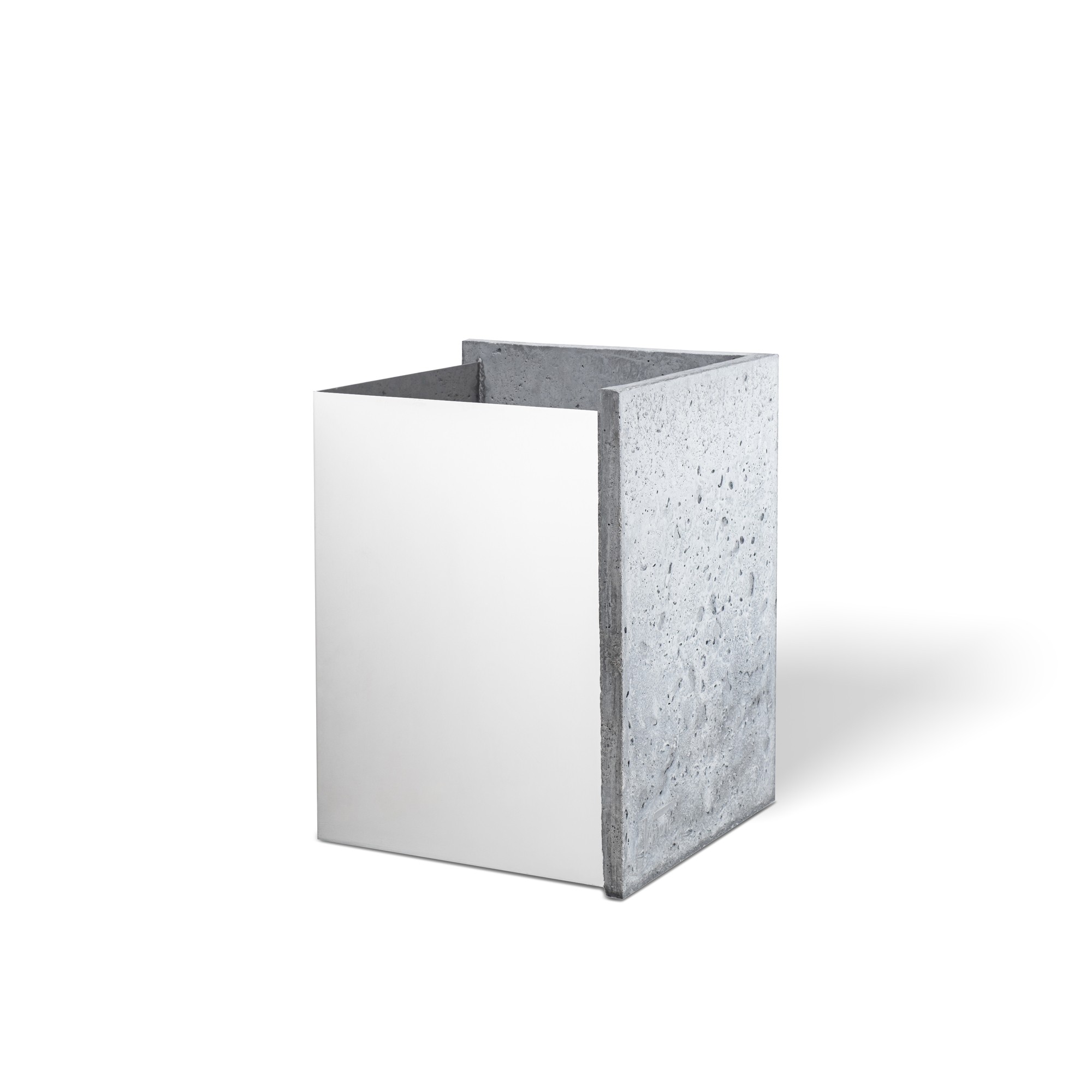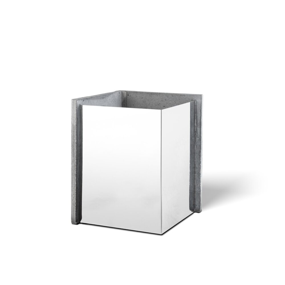 Katmanlaşan kabuk tasarım anlayışıyla geliştirilen, beton ve paslanmaz çelik birleşiminden oluşan modern saksı.